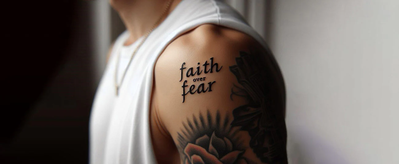 For those who prefer a more classic and timeless look, a monochromatic “Faith Over Fear” tattoo on the shoulder offers a striking yet subtle design. Black ink tattoos, with their simplicity and stark contrast, emphasize the power of the message without distracting from the phrase itself. The shoulder is a great location for this design, as it provides enough space for creative lettering and additional design elements such as shading or minimalistic shapes. This style appeals to those who want a tattoo that is both bold and elegant.